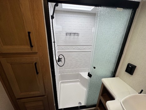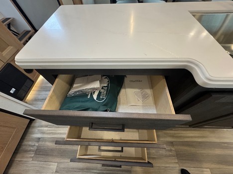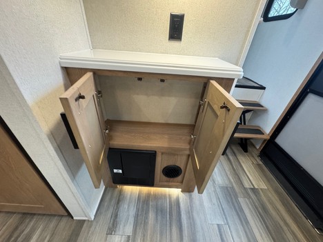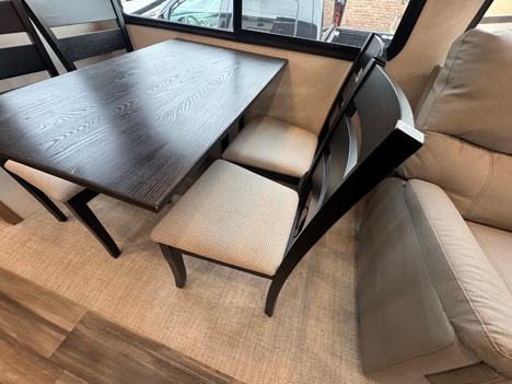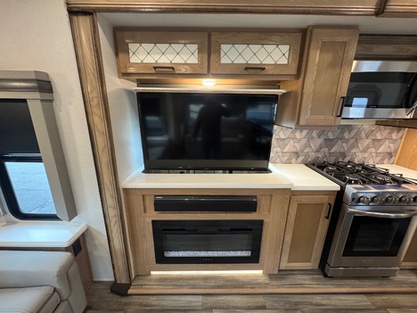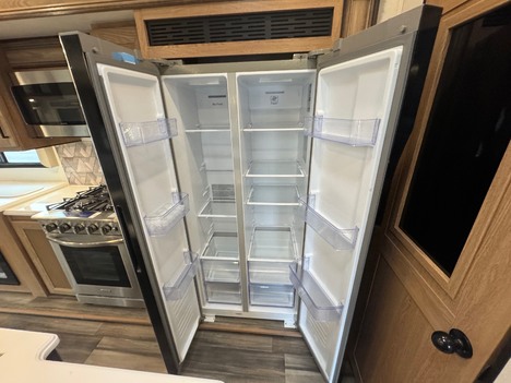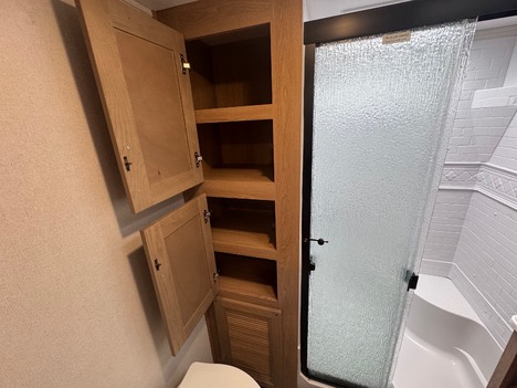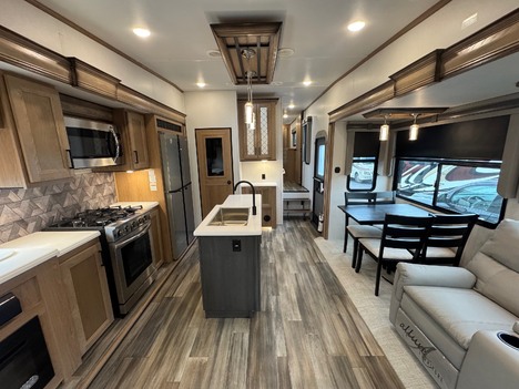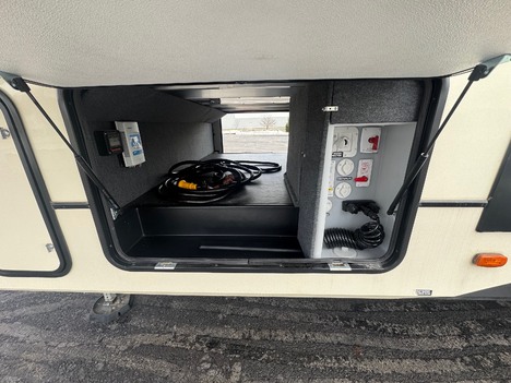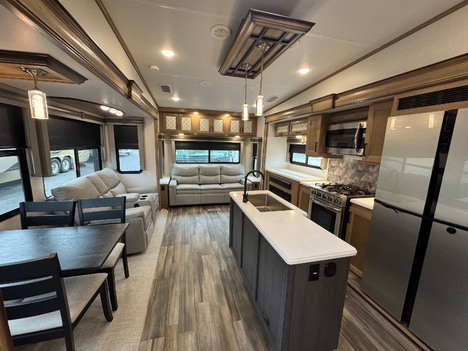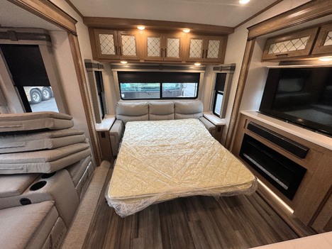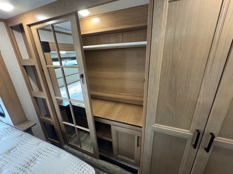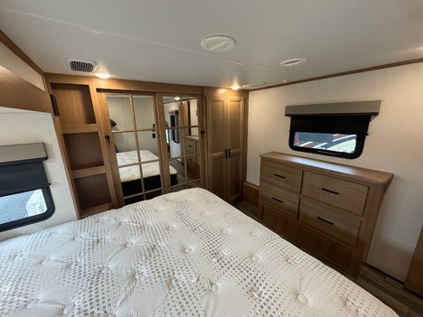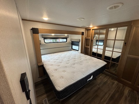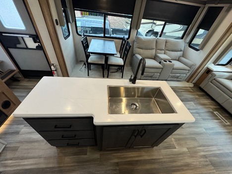 23 Forest River Sanibel 3102RSWB 36’ 5th wheel camper. Front master bedroom with a 72in wide x 80in long master king bed, under bed storage, large sliding door wardrobe cabinet with hanging clothing rods and drawer storage, large cabinet to the right of the master closet is plumbed for a stackable washer and dryer but currently has shelving for storage, 4 drawer dresser at the foot of the bed. Master bathroom has a large standup shower with sliding glass doors, large vanity sink with storage, vanity mirrored cabinet. Kitchen has a large center island with Corian counter tops and large stainless steel rectangle sink, full size pantry cabinet, Furrion French door residential fridge and freezer, dinette table with 4 chairs, Insignia 4 burner gas stove and oven and a Greystone microwave. The living Room a hidden 50in Summit TV on an electric elevator, Furrion sound bar, 36in electric fireplace, Allure recliners with cup holders, sofa and pullout sofa bed. Black out window shades throughout, Linoleum throughout, (2) Dometic ducted roof top AC units, power roof vents. Outside there is an 11’ patio awning on the slide out, 16’ main awning patio, LED lights on both awnings, exterior speakers, (2) 30 gallon propane tanks, ST235/75R16 tires, 2022 date codes, aluminum wheels, spare wheel and tire on a bumper mount, 50A electric, Dometic furnace, Dometic 6 gallon electric and propane hot water heater, black tank flush, battery shut off, solar charging system, large heated full pass through front storage compartment, LCI automatic leveling, 6 jack system, new house battery, docking lights. 13817lbs GVWR, 6000lbs axles, 10957lbs empty weight, 2801lbs CCC, 3 slides, sleeps 4, 54 gallon fresh water tank, 73 gallon gray water tank, 39 gallon black water tank, 5100 btu fireplace, 35000btu furnace, 15000/13500btu AC units, 13’1in overall height, 100in wide, 1817lbs hitch weight. new master bedroom mattress on 3/10/26.
